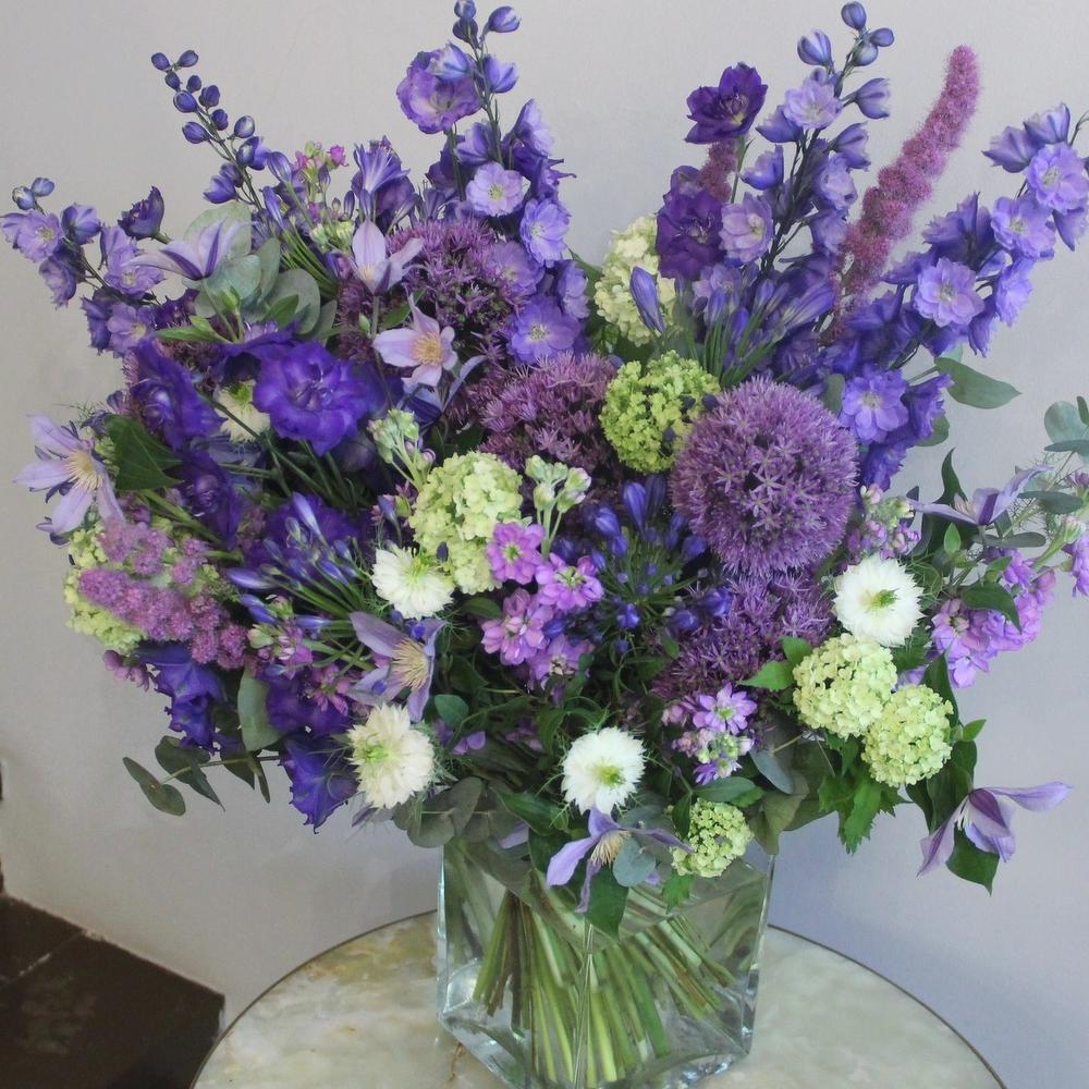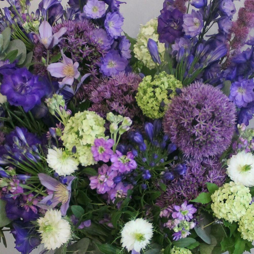 Аллиум – 5 шт.Маттиола – 9 шт.Вибурнум – 5 шт.Клематис – 5 шт.Нигелла – 5 шт.Дельфиниум – 7 шт.Агапантус – 3 шт.Эвкалипт – 11 шт.Лента атласная – 2 шт.Фисташка – 3 шт.