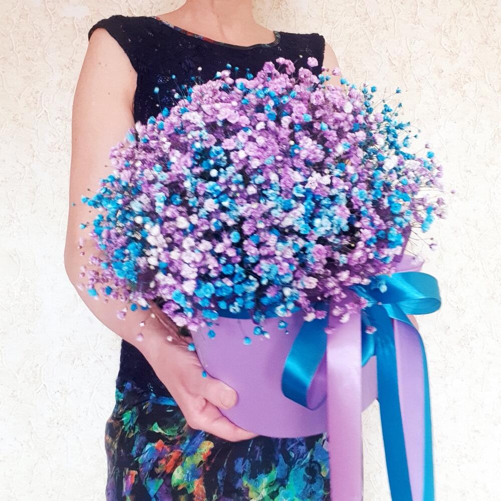 “Сиреневый туман” – композиция из гипсофилы в шляпной коробке