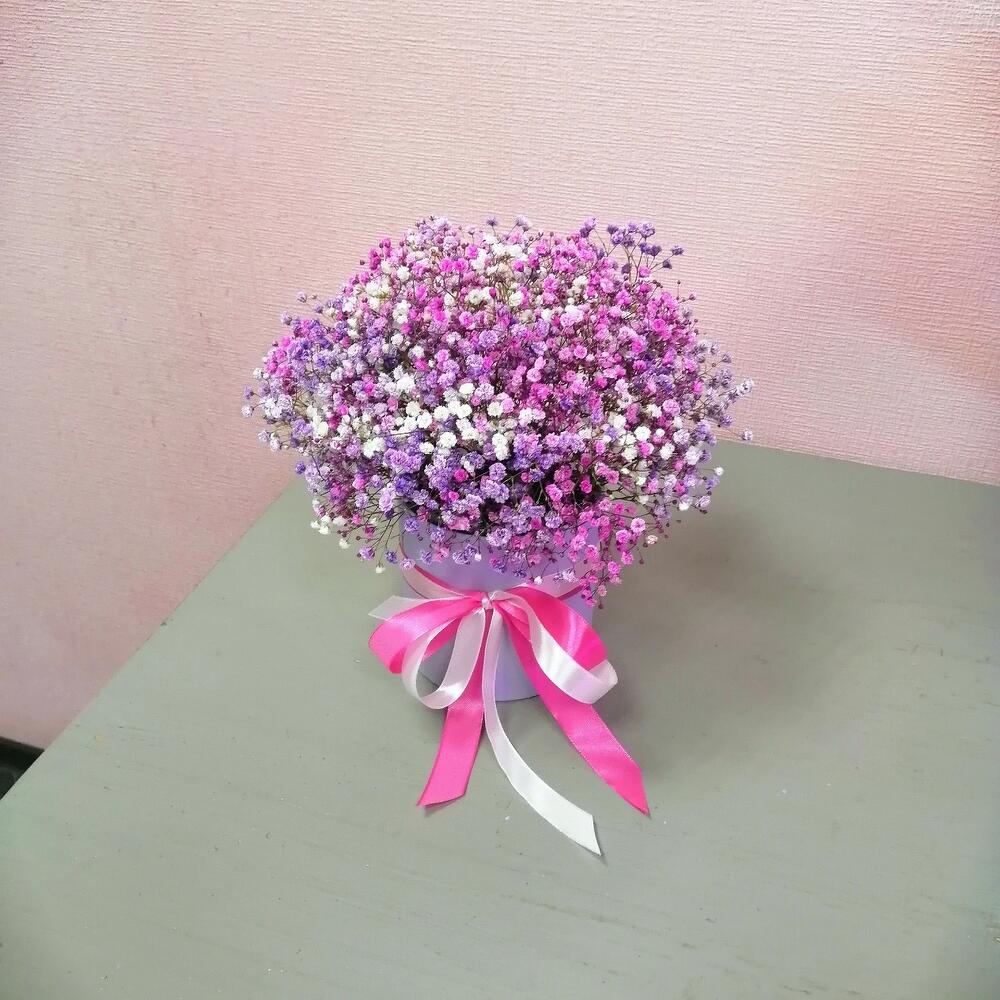 “Сиреневый туман” – композиция из гипсофилы в шляпной коробке