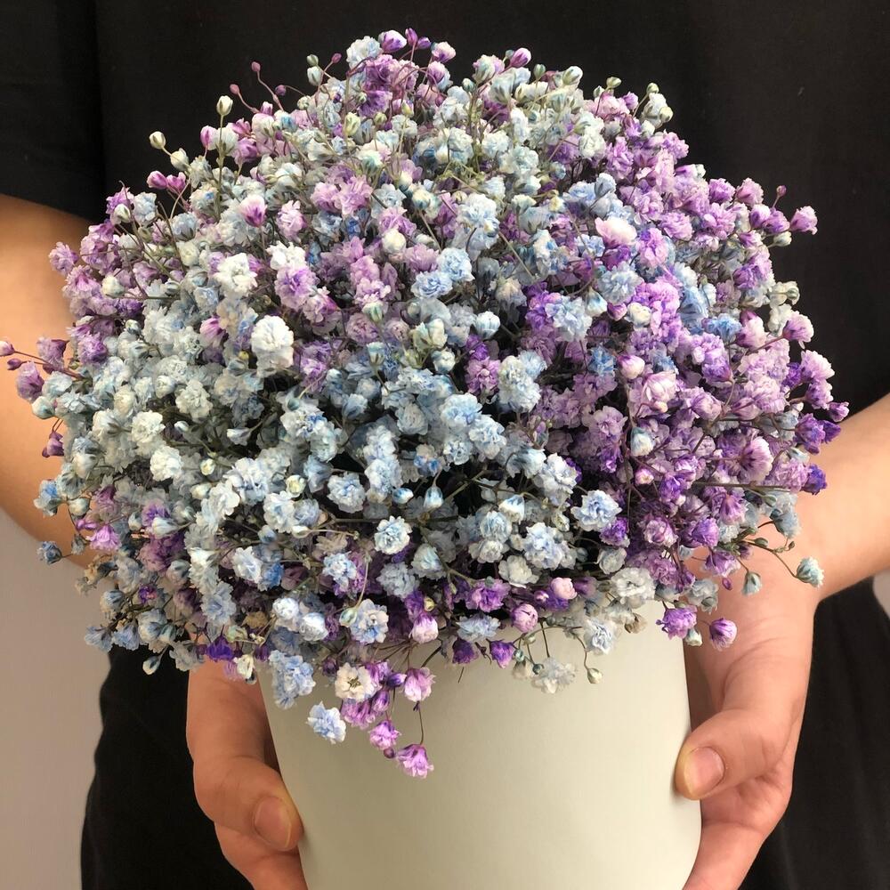 Композиция из гипсофилы в шляпной коробке «черника со льдом»