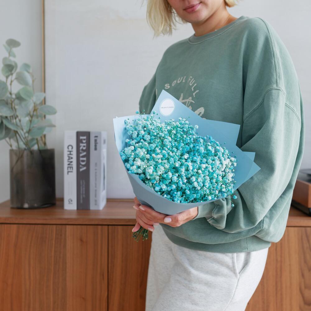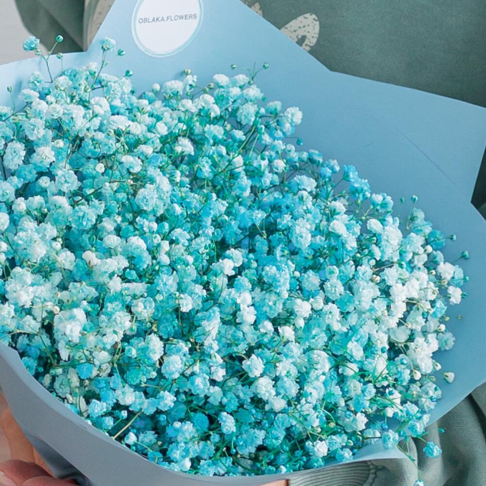 гипсофила цветная – 7 шт.Пленка корейская – 2 шт.Лента атласная – 1 шт.Упаковка транспортировочная пленка – 1 шт.