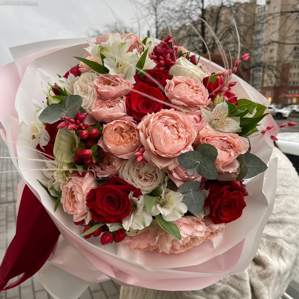 Альстромерия – 7 шт.Красная роза – 9 шт.Пленка матовая – 2 шт.Red Piano роза – 4 шт.джульетта роза пионовидная – 7 шт.Фоамиран (упаковка) – 2 шт.бриза сухоцвет – 10 шт.white o’hara – 3 шт.