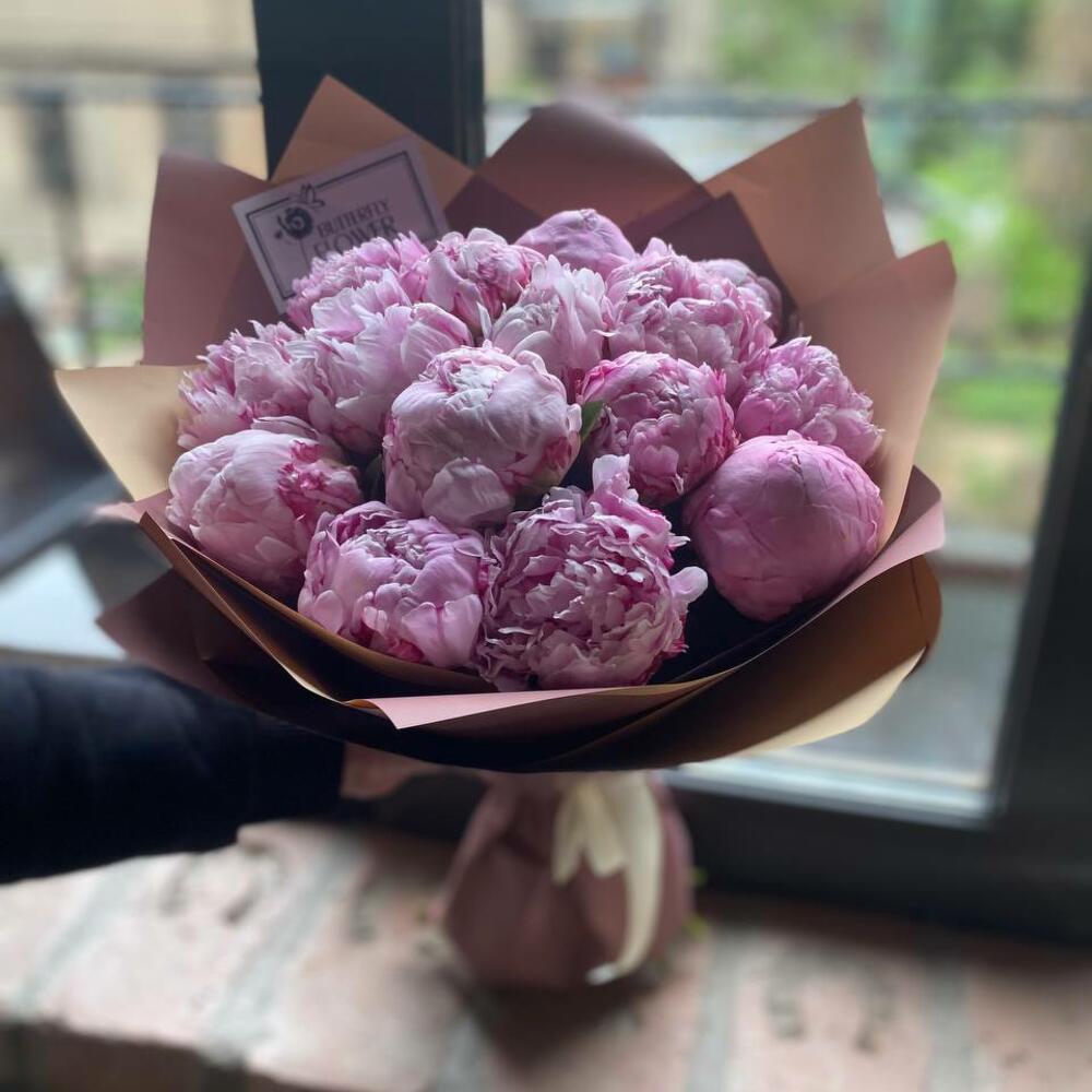 Букет из 15 розовых пионов в дизайнерской упаковке “Принцесса Маргарита”