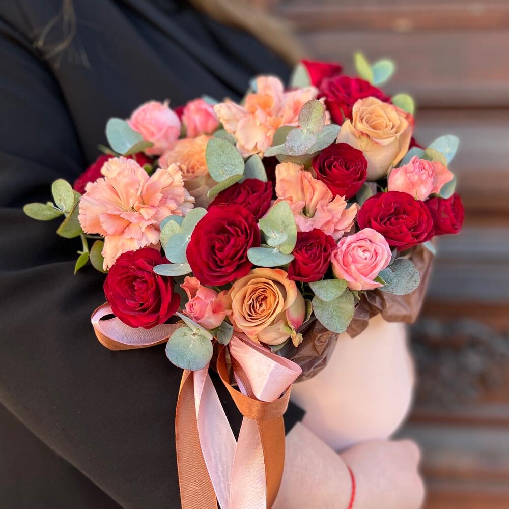 Роза Капучино – 3 шт.Эвкалипт – 3 шт.Лента атласная – 2 шт.Диантус – 3 шт.Коробка шляпная – 1 шт.Оазис флористический – 1 шт.роза кустовая мадам бомбастик – 1 шт.роза кустовая пионовидная ред трендсеттер – 2 шт.