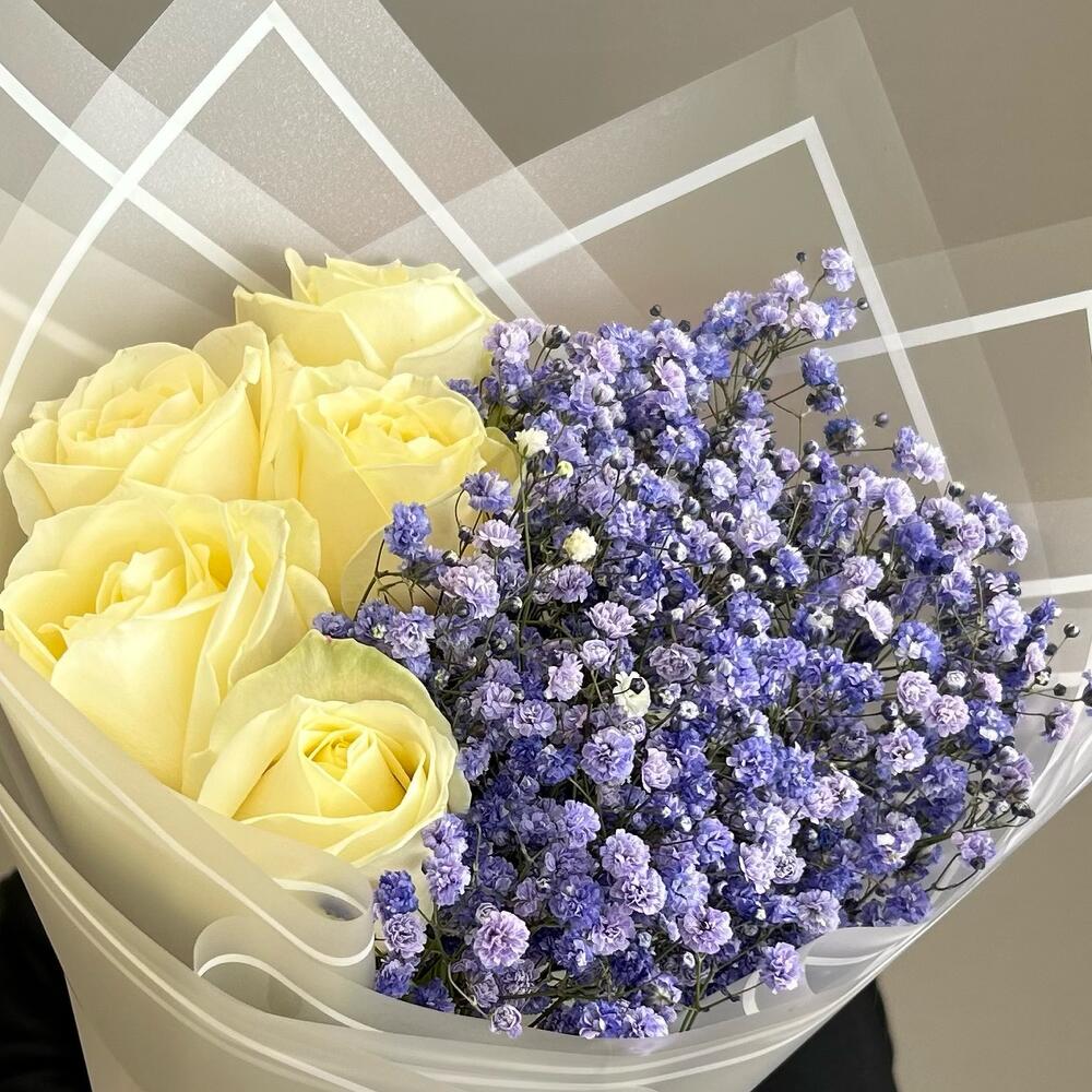 Гипсофила – 4 шт.Роза – 5 шт.Лента атласная – 1 шт.Упаковка дизайнерская – 2 шт.