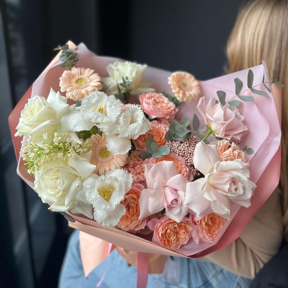 Кустовая пионовидная роза – 2 шт.Одноголовая роза – 6 шт.Гербера – 3 шт.Тюльпан – 3 шт.Озотамнус – 1 шт.Сирень – 1 шт.Эвкалипт – 3 шт.декоративная упаковка – 1 шт.Атласная лента – 1 шт.