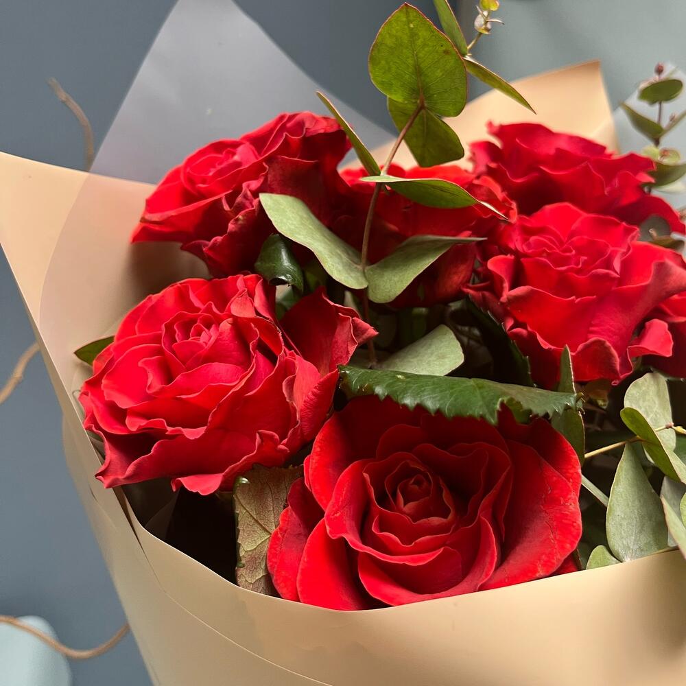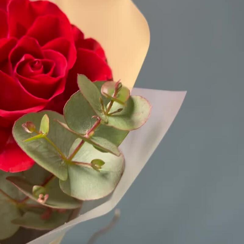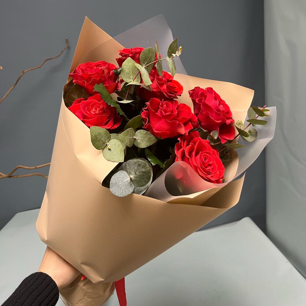 Эвкалипт – 3 шт.Роза одноголовая – 7 шт.Лента атласная – 1 шт.Упаковка дизайнерская – 2 шт.