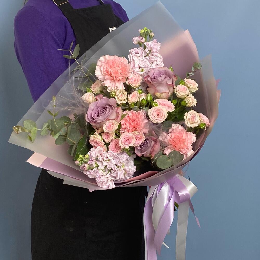 Роза сиреневая – 3 шт.Роза кустовая – 3 шт.маттиола сиреневая – 2 шт.Диантус розовый – 3 шт.Ковыль – 2 шт.Эвкалипт – 2 шт.Упаковка дизайнерская – 2 шт.Лента атласная – 2 шт.
