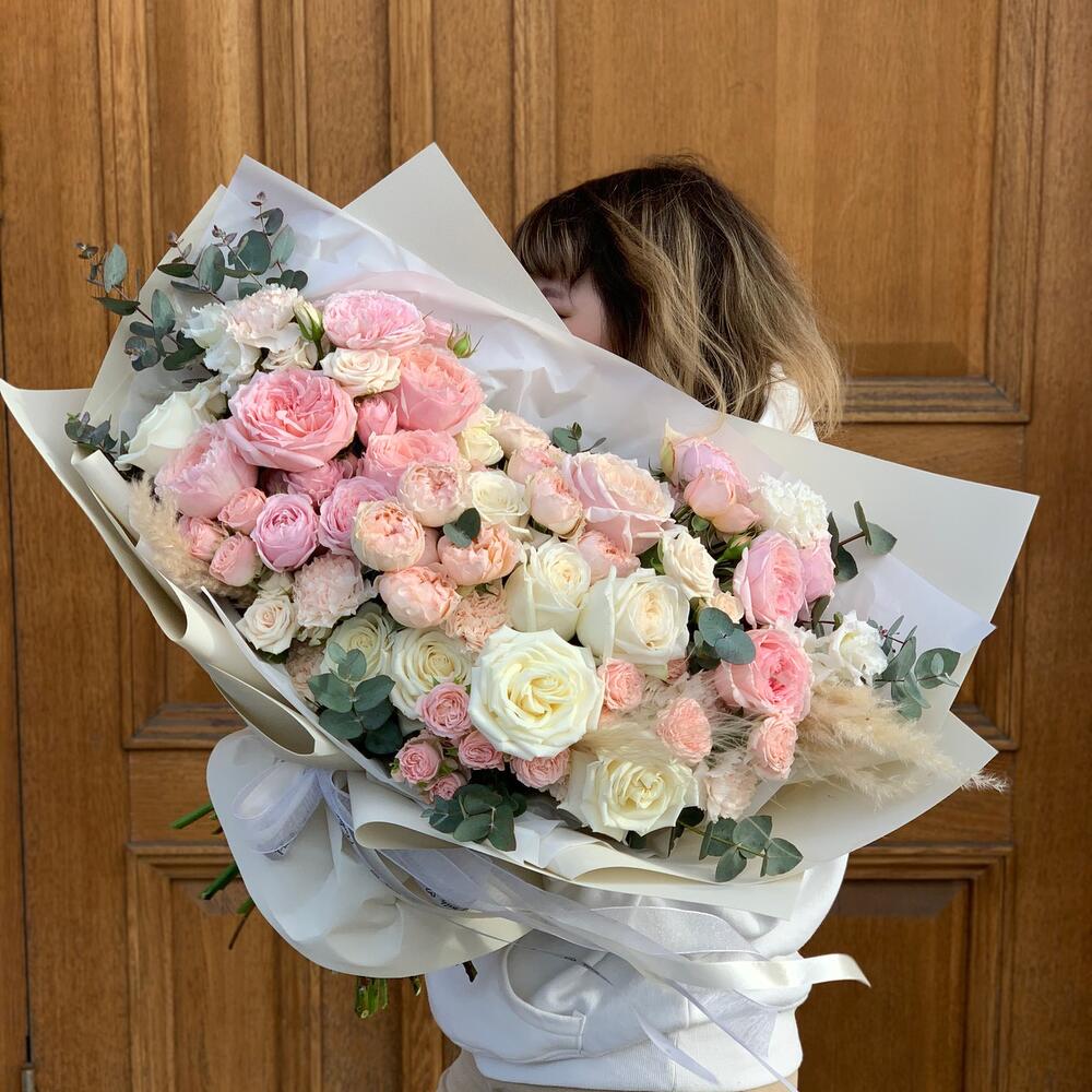 Роза белая – 7 шт.Роза пионовидная – 7 шт.Кустовая роза – 5 шт.Лизиантус – 2 шт.перо декоративное – 1 шт.Эвкалипт – 1 шт.