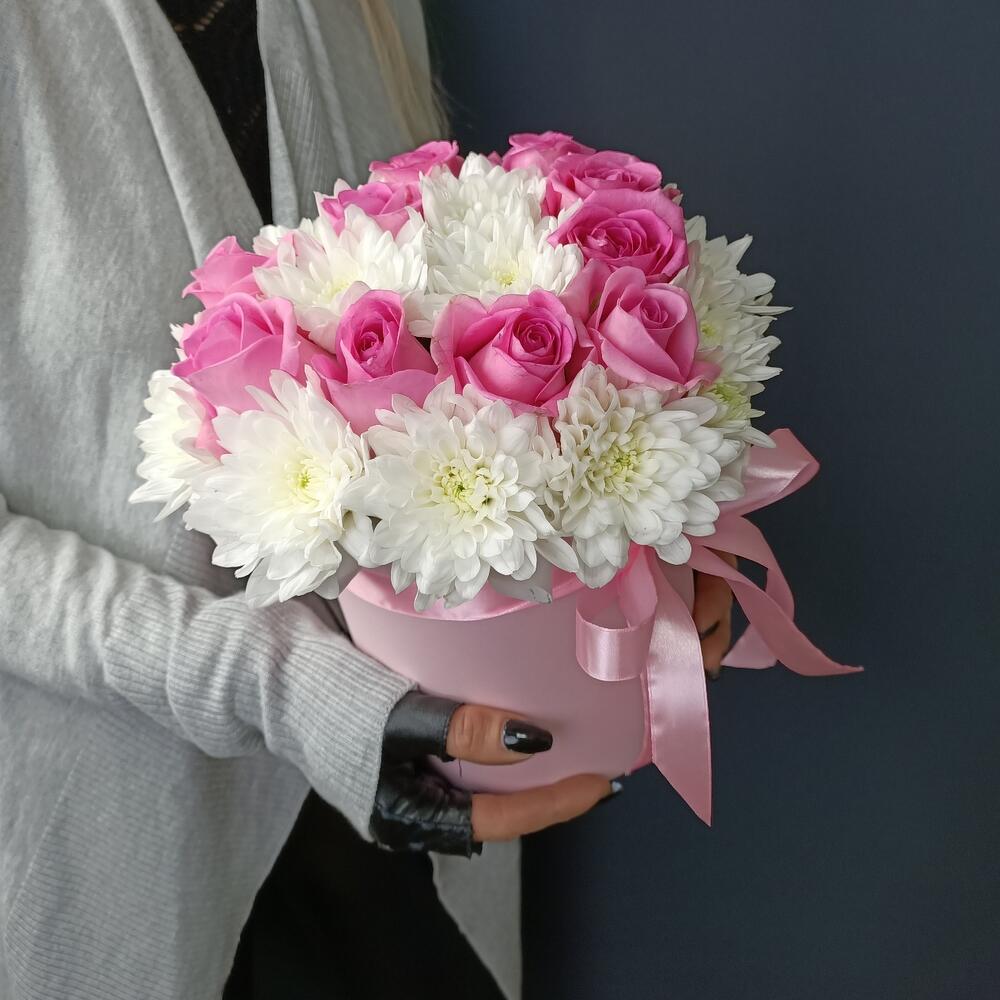 Хризантема кустовая – 4 шт.Роза – 10 шт.Шляпная коробка с лентами – 1 шт.