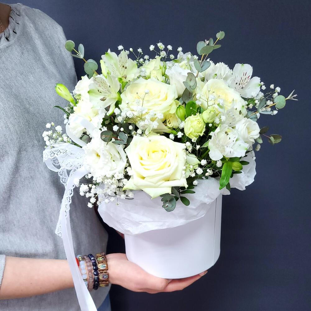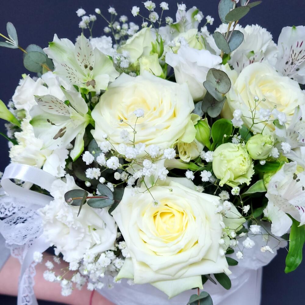 Альстромерия – 3 шт.Гипсофила – 1 шт.Лизиантус – 1 шт.Гвоздика – 3 шт.Роза белая – 3 шт.