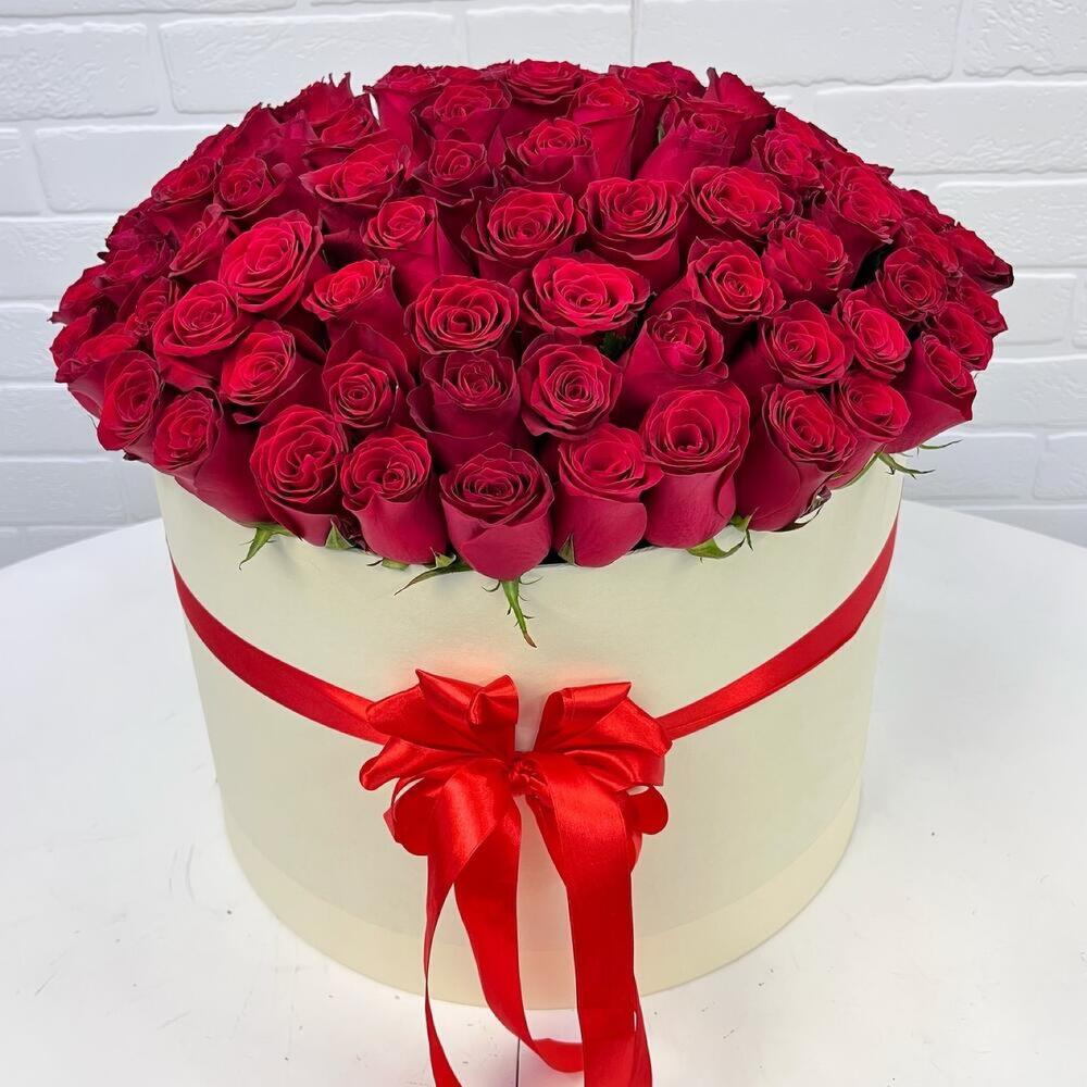 розы эквадор – 101 шт.Шляпная коробка – 1 шт.Лента атласная – 1 шт.