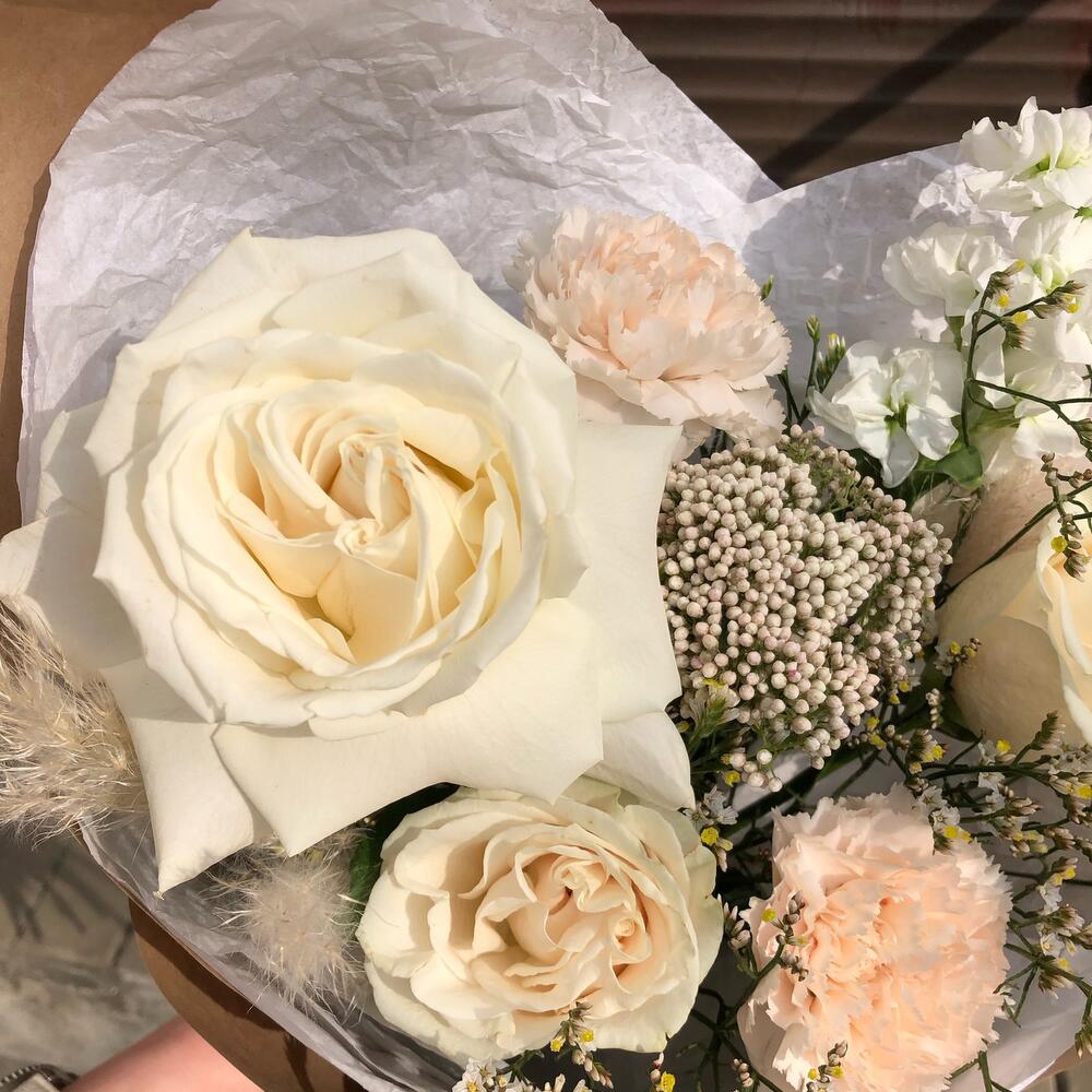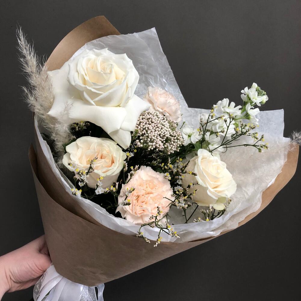 Лента – 2 шт.Озотамнус – 1 шт.Тишью – 2 шт.Роза Венделла – 2 шт.Лимониум белый – 2 шт.Диантус кремовый – 2 шт.Крафт бумага – 2 шт.маттиола белая ароматная – 1 шт.роза плайя бланка пионовидная белая – 1 шт.декор пампасная трава – 2 шт.